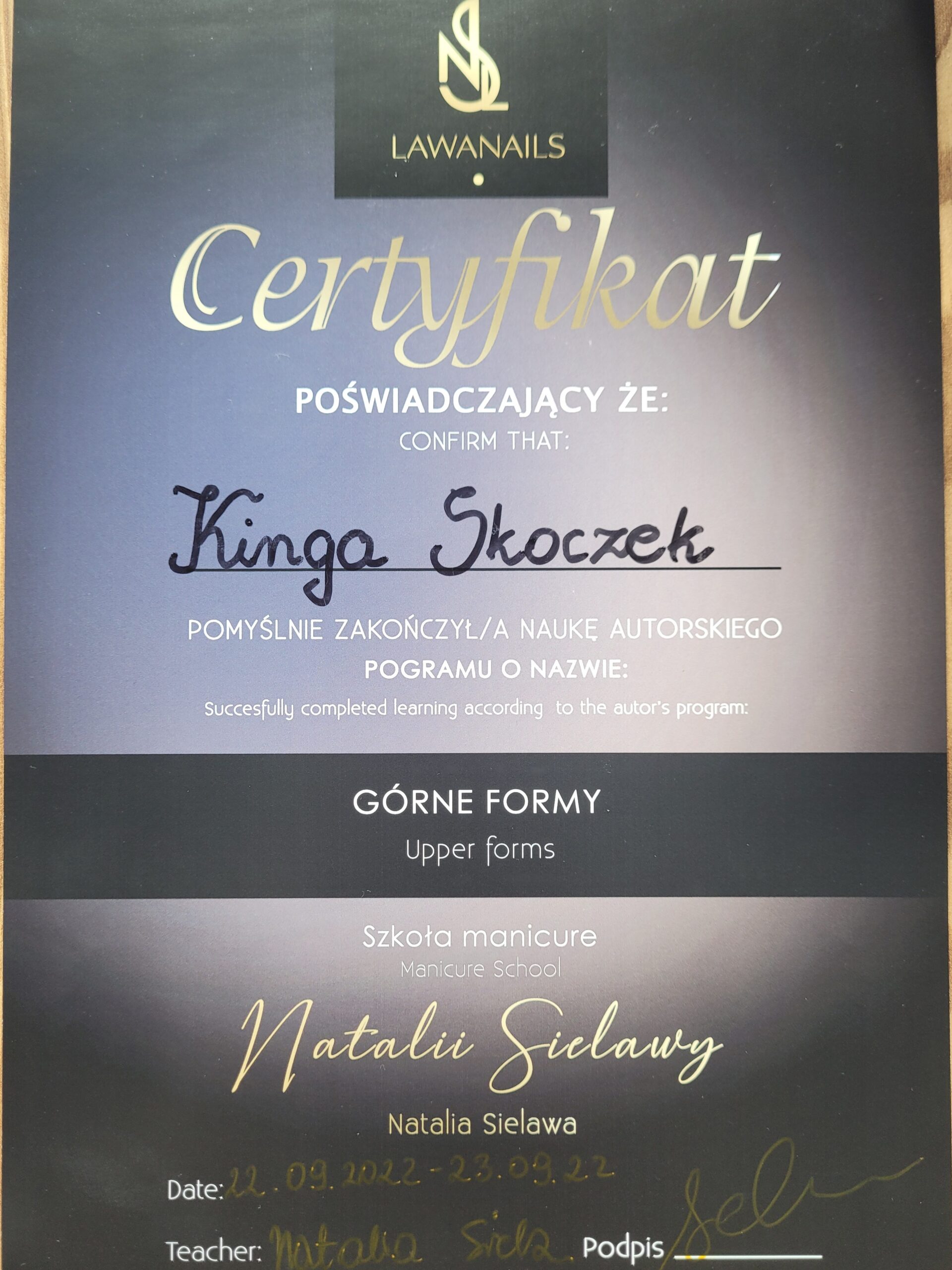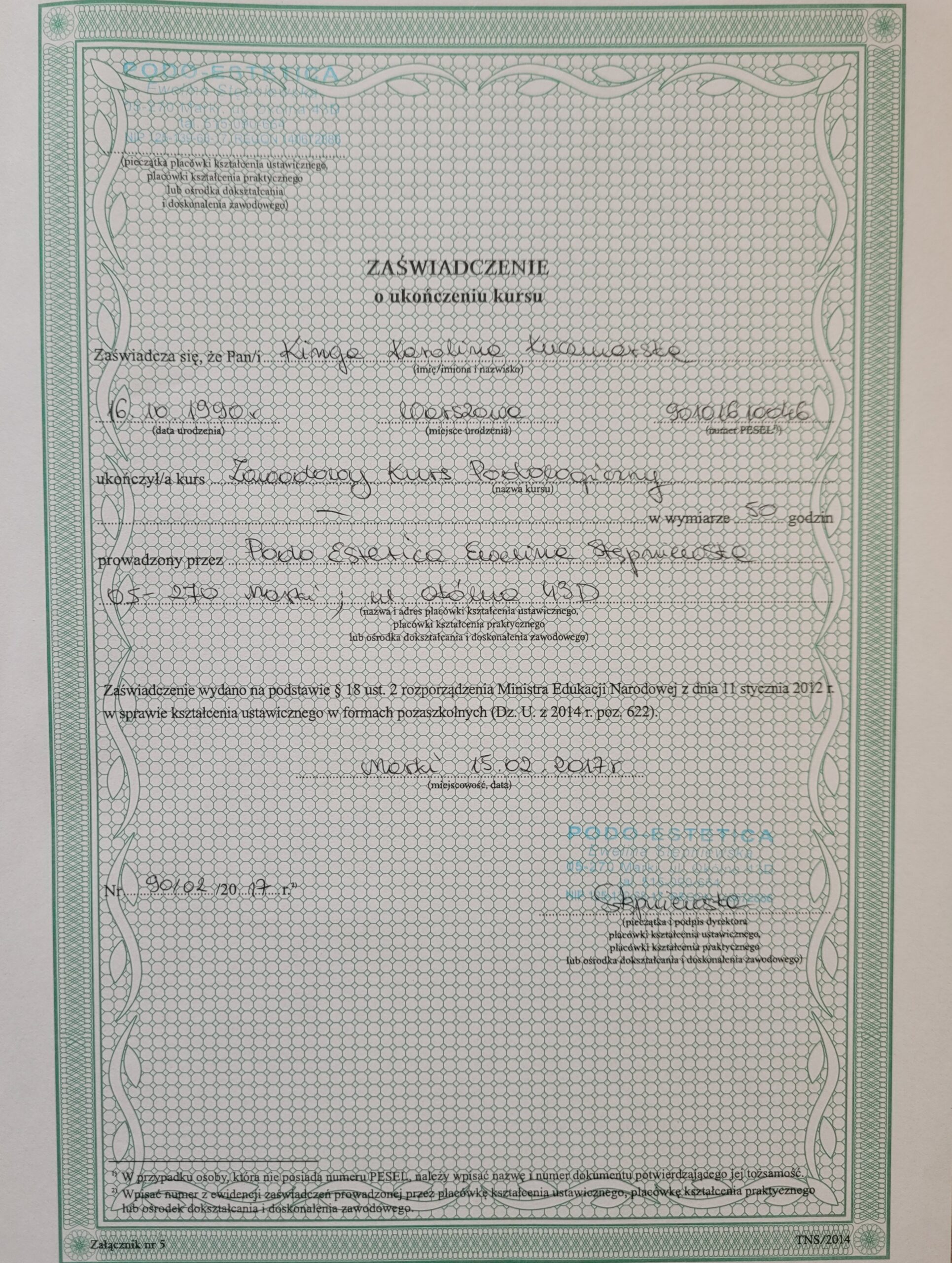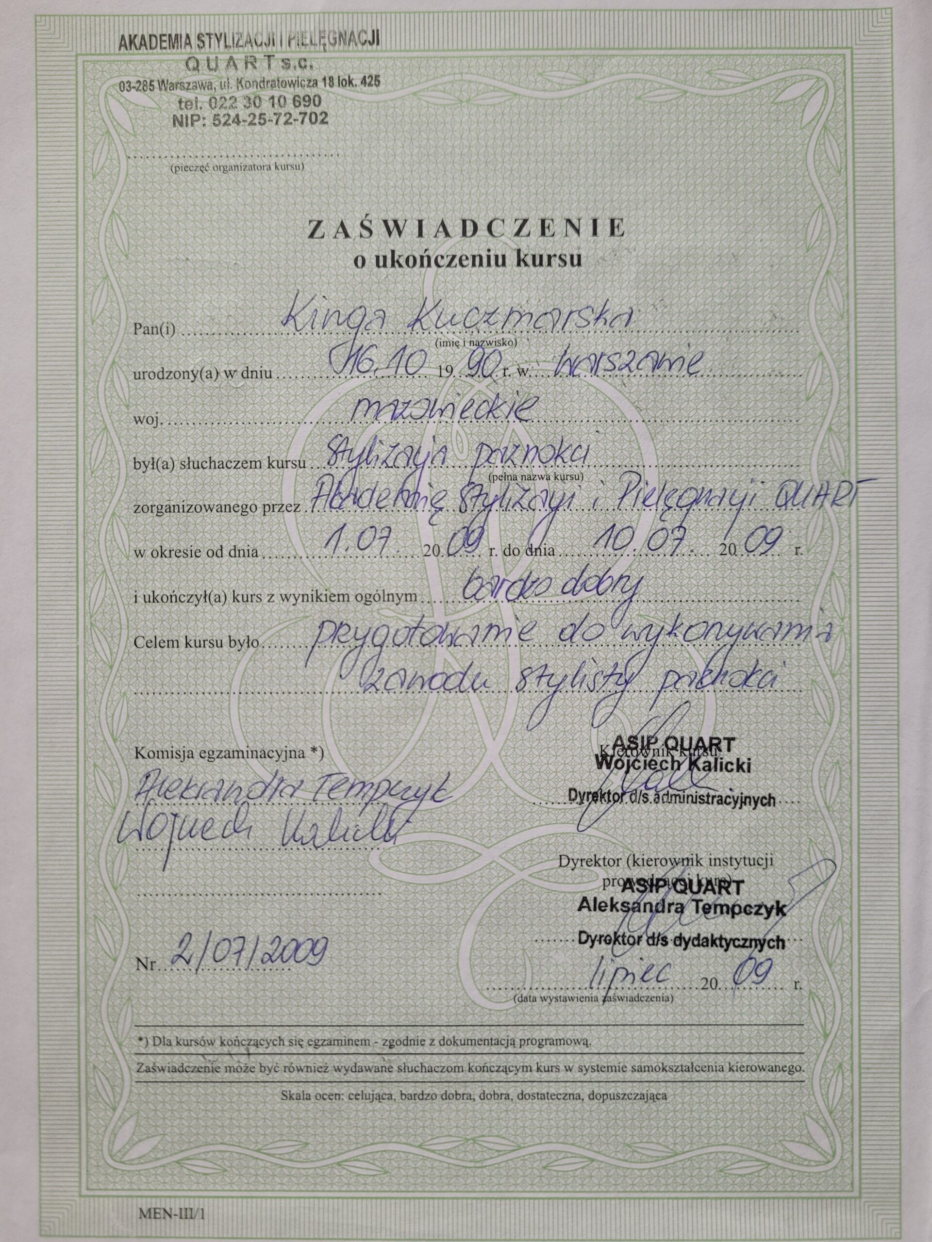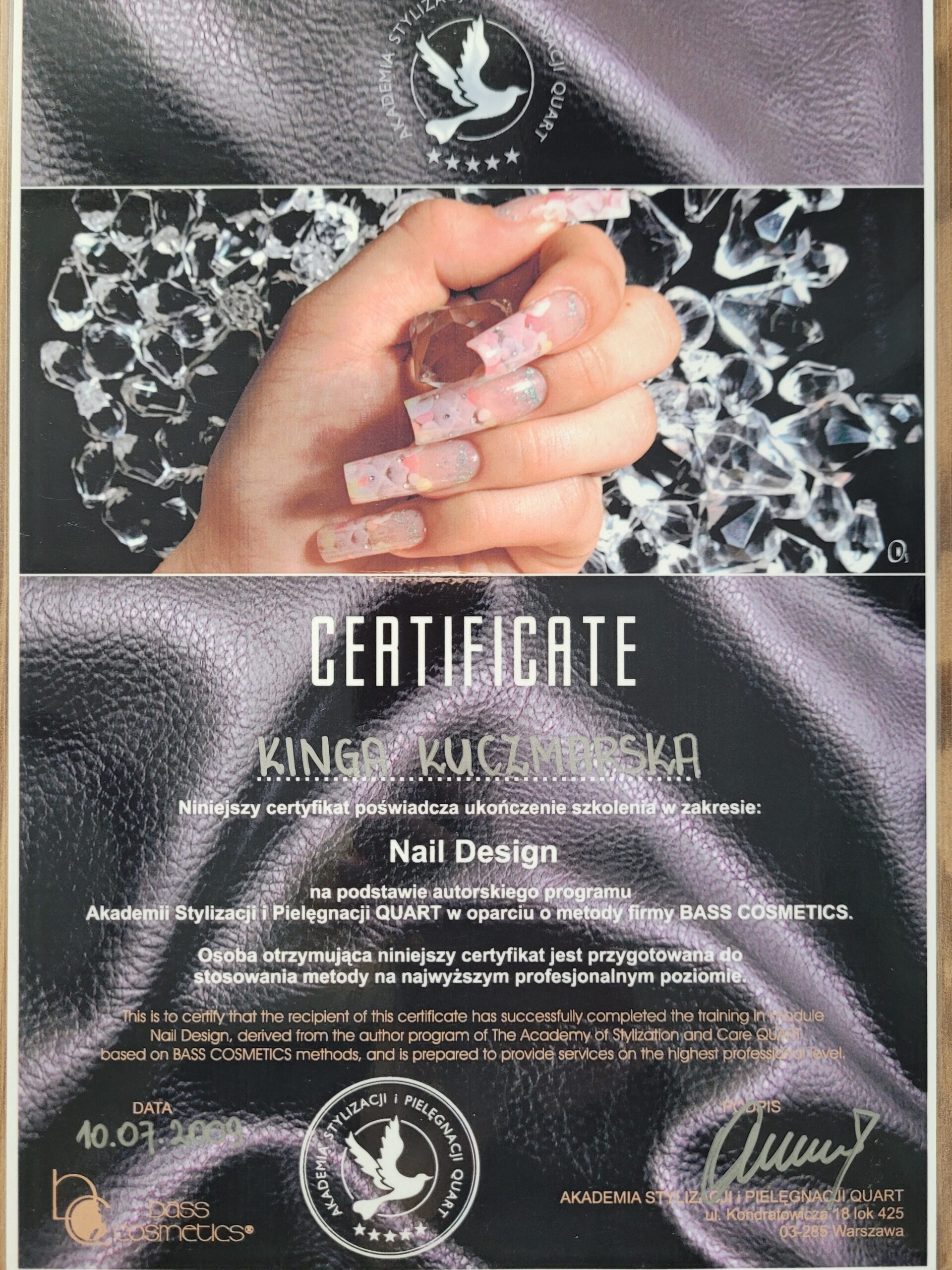 W 2009 roku ukończyłam pierwszy kurs stylizacji paznokci. Dwa lata później uzyskałam tytuł Technika Usług Kosmetycznych kończąc tym samym szkołę kosmetyczną. Od razu zaczęłam pracę na stanowisku kosmetyczki i stylistki paznokci, a w kolejnych latach uczestniczyłam w około 20 dodatkowych szkoleniach kosmetycznych.