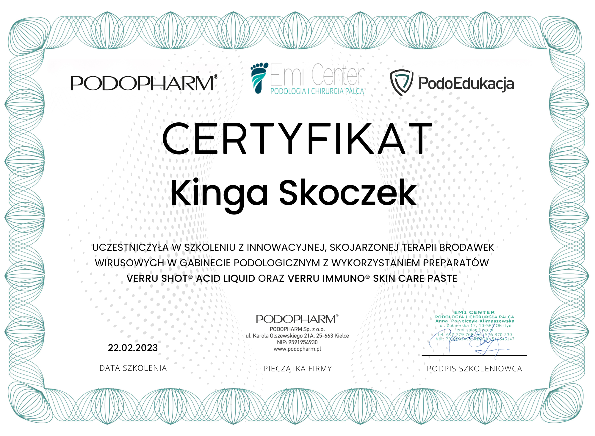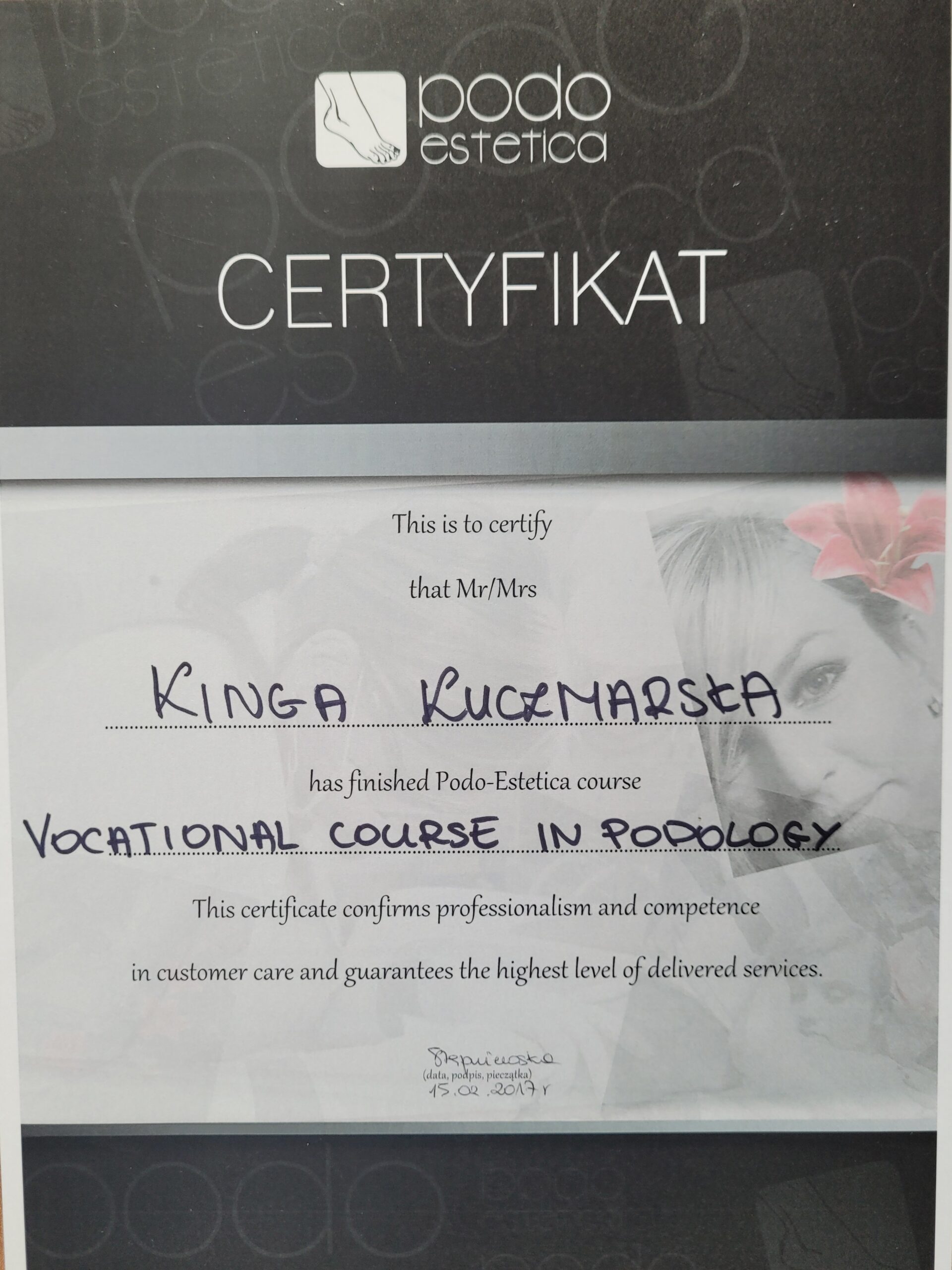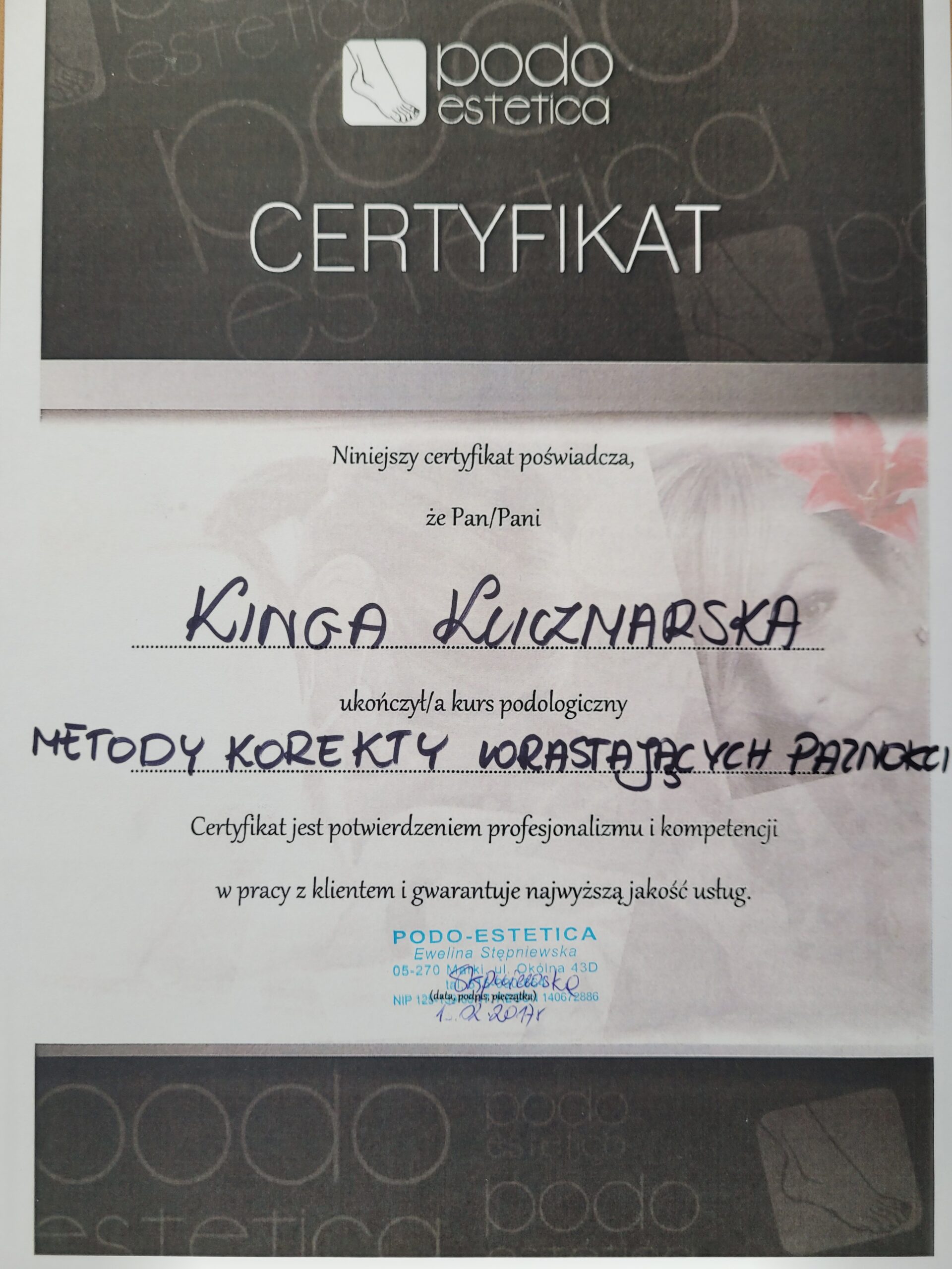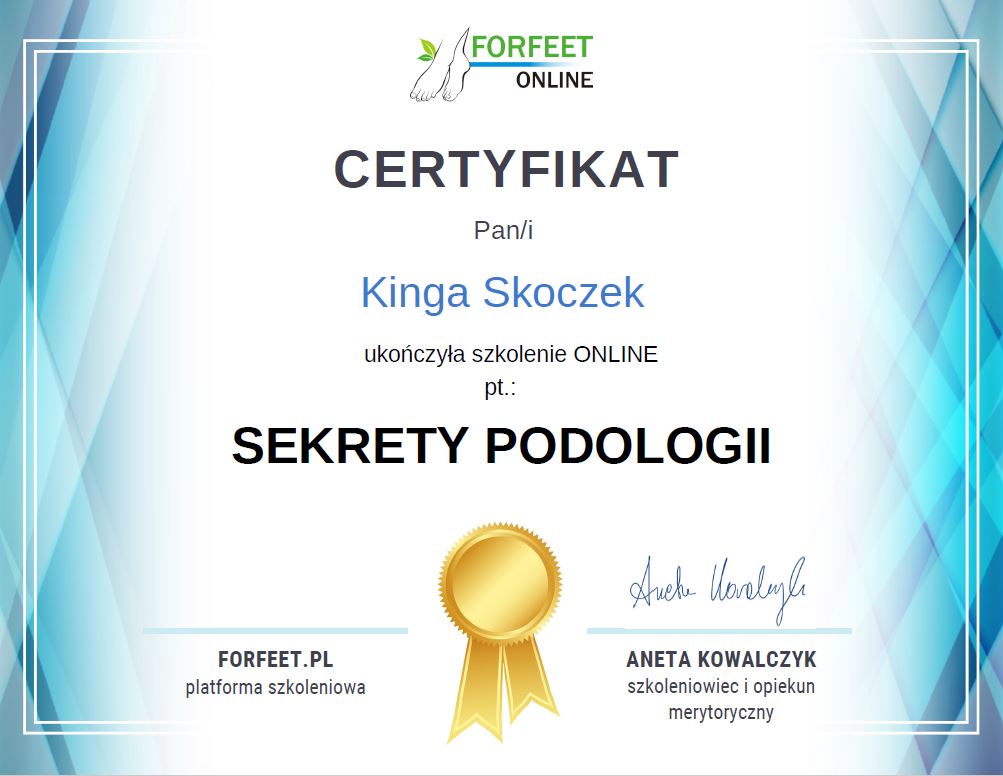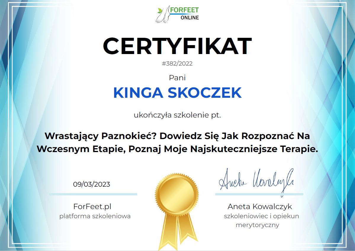 W 2017 roku ukończyłam zawodowy kurs podologiczny dzięki któremu wprowadziłam nowe usługi do gabinetu. Zajmuję się problemem wrastających paznokci, odciskami, pękającymi piętami, nadmiernymi rogowaceniami na podeszwach stóp,